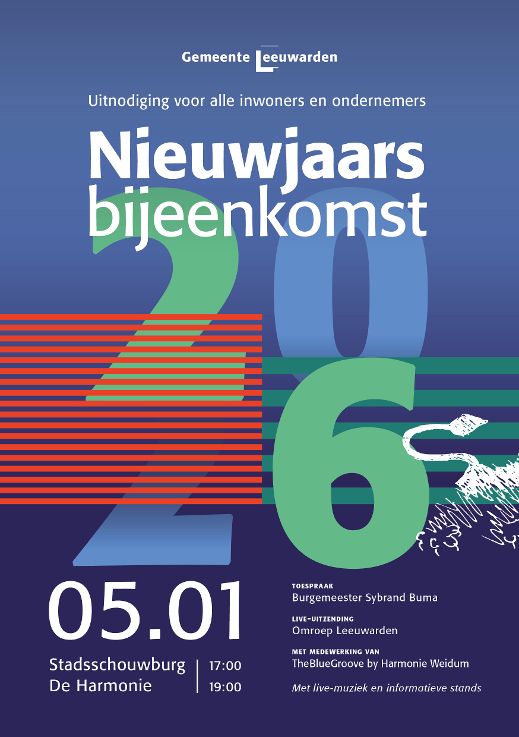 Graag nodigen we u uit voor de nieuwjaarsbijeenkomst van de gemeente Leeuwarden op maandag 5 januari 2026 van 17:00 tot 19:00 uur in stadsschouwburg De Harmonie in Leeuwarden. Het wordt een informele en gezellige avond met hapjes, drankjes en livemuziek. Burgemeester Sybrand Buma houdt een toespraak, er zijn leuke en informatieve stands en er is een tentoonstelling te zien over het Programma Binnenstad waardoor Leeuwarden de komende jaren groener, aantrekkelijker en beter bereikbaar wordt.
