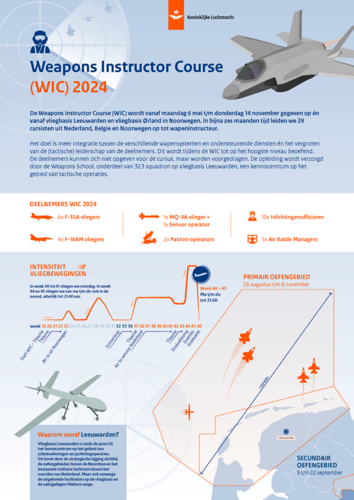 Momenteel hoor je veel vliegtuig geluiden wanneer je in het dorp bent, maar waarom dan? Er vind momenteel een Weapon Instructor Course (WIC) plaats. De WIC wordt afgesloten met een eindexamen. Tijdens dit eindexamen, van 28 oktober t/m 8 november, vinden de vliegbewegingen plaats in de middag en avond. De laatste vliegtuigen landen dan rond 21:00 uur. Het vliegveld blijft geopend tot uiterlijk 22:30 uur.